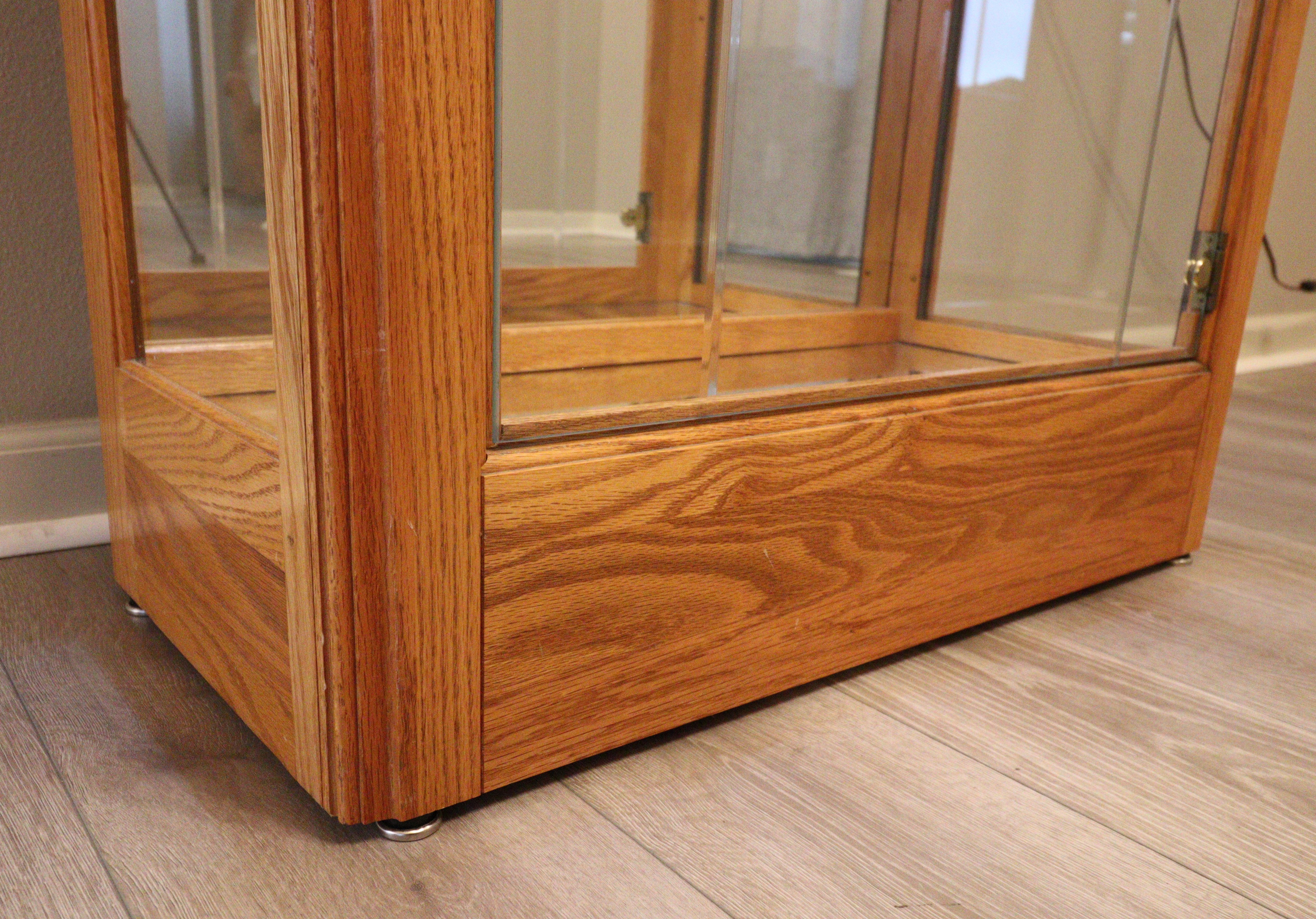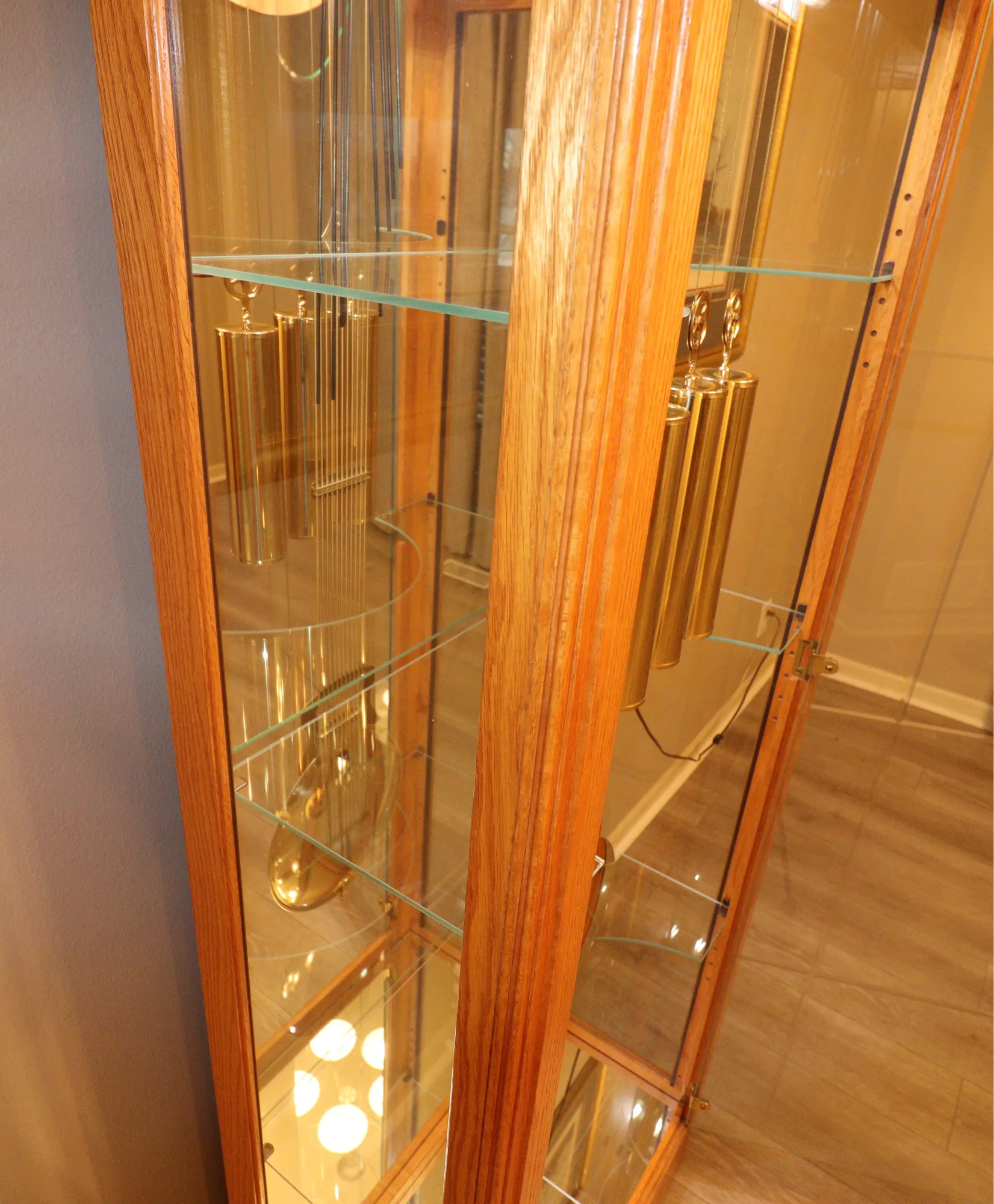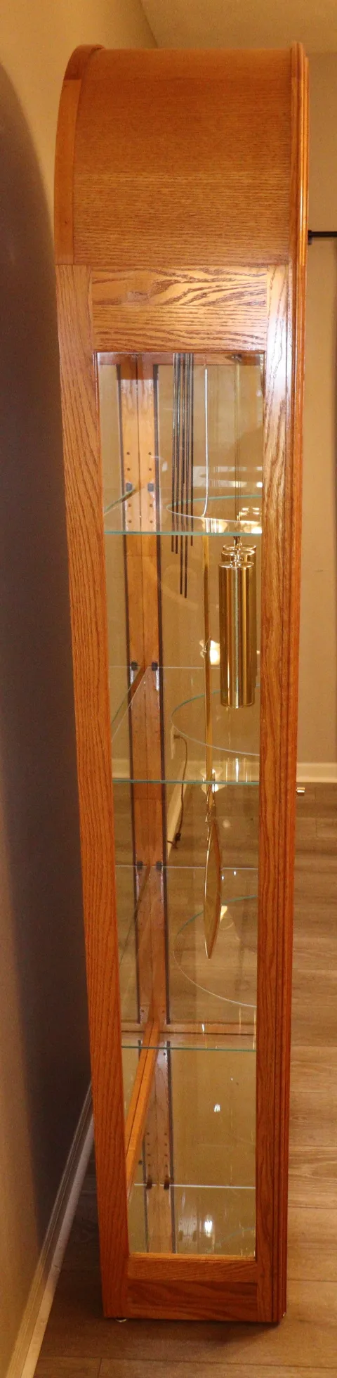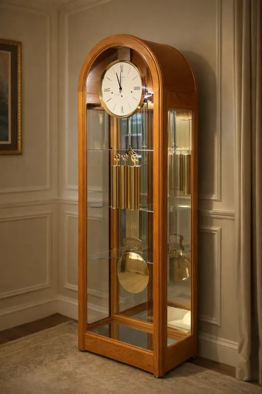 Crafted in a warm oak case, the clock features a gracefully arched bonnet and full-length tempered glass door, offering uninterrupted visibility of the interior. Inside, a fully mirrored back panel amplifies light and depth, transforming the cabinet into a striking display environment.