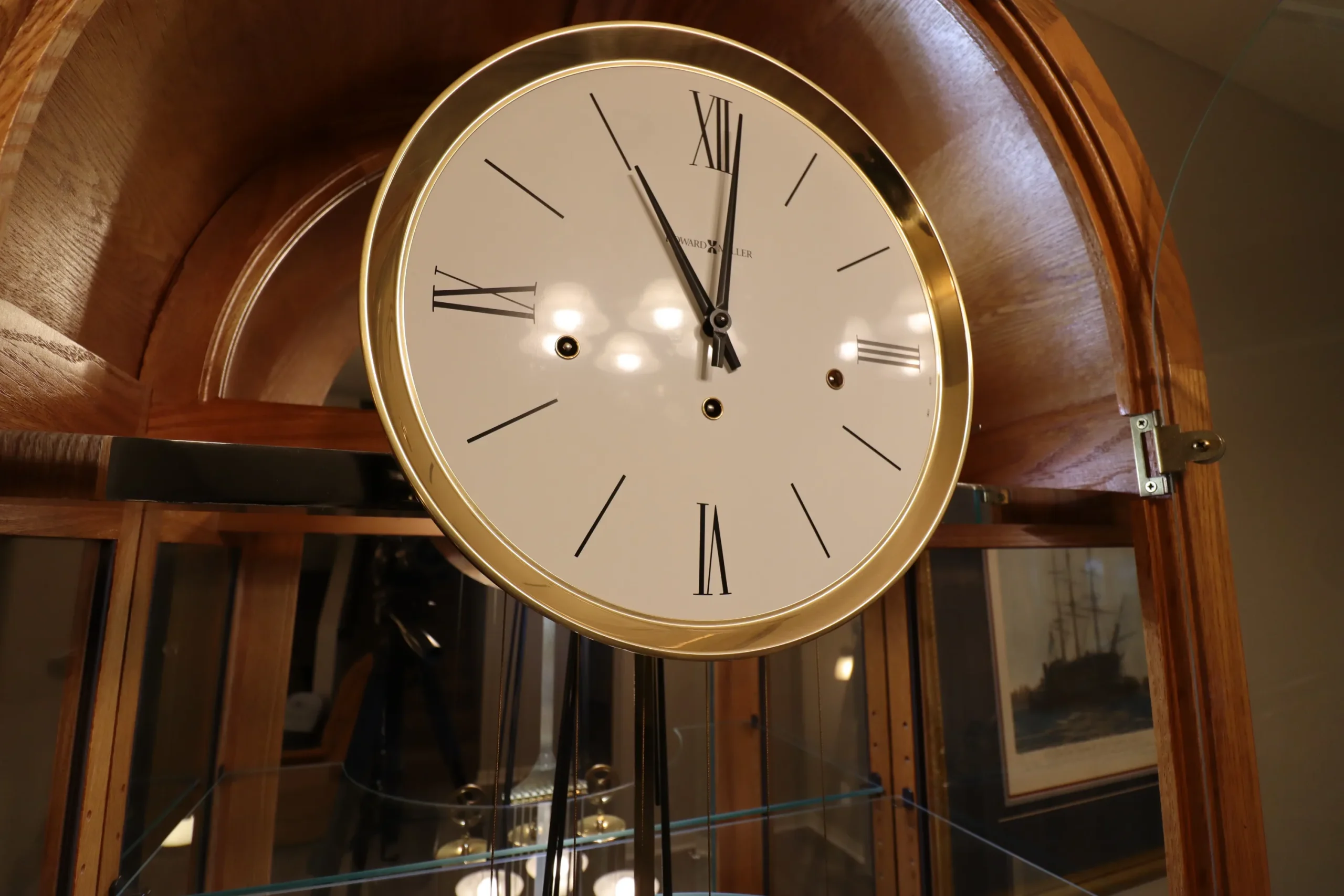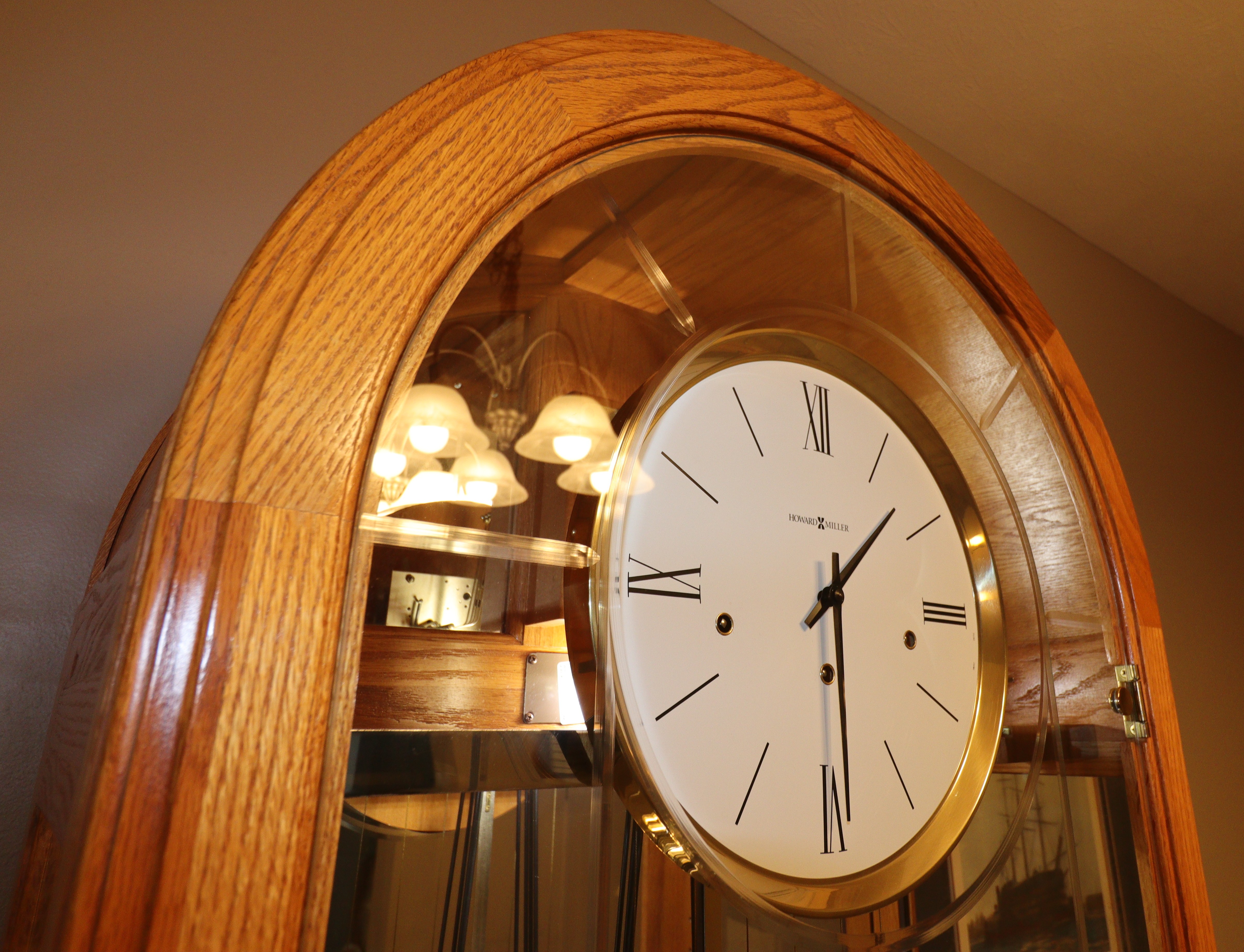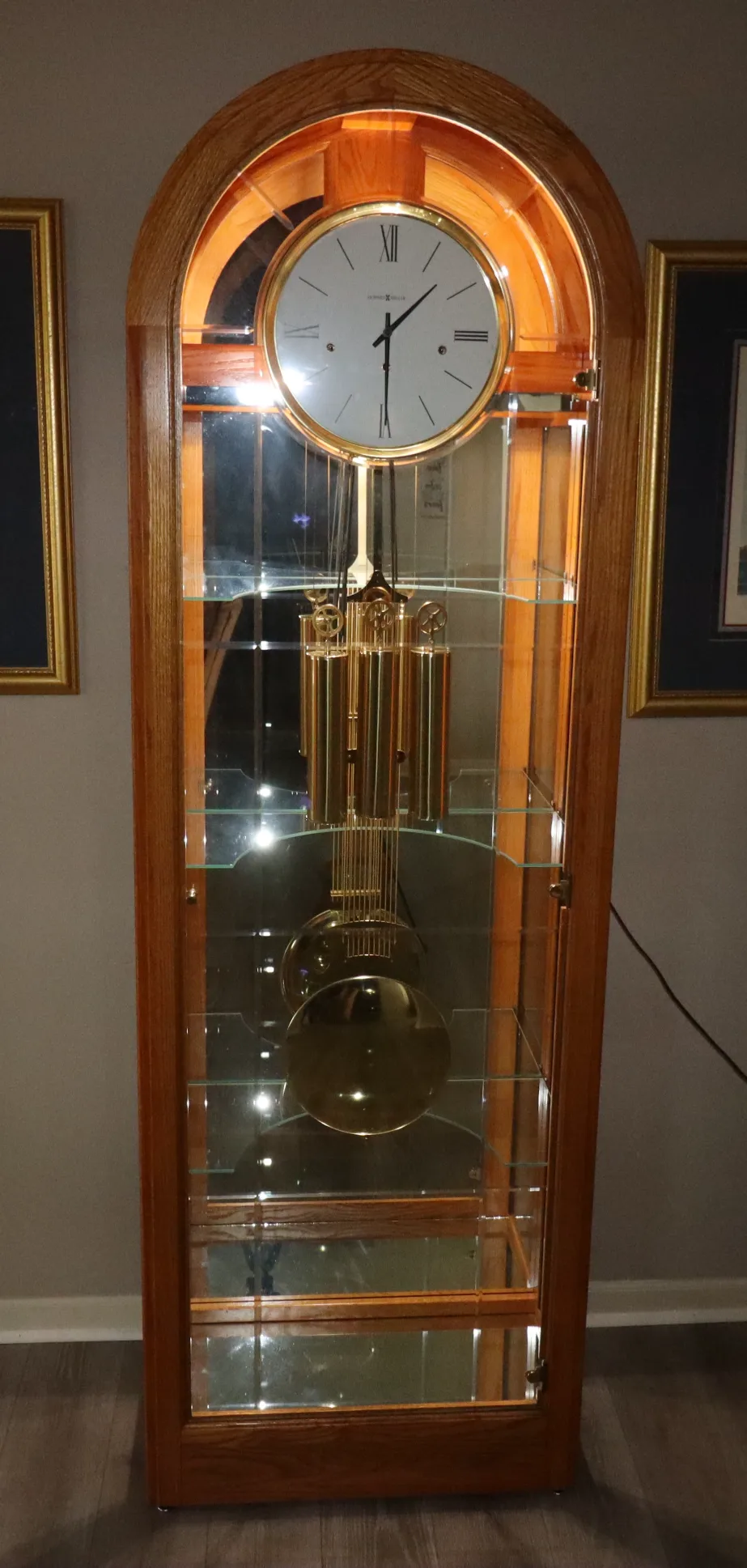 A refined example of late 20th-century American horology, this Howard Miller “Eternity II” curio grandfather clock (Model 610-683) blends precision timekeeping with architectural display.