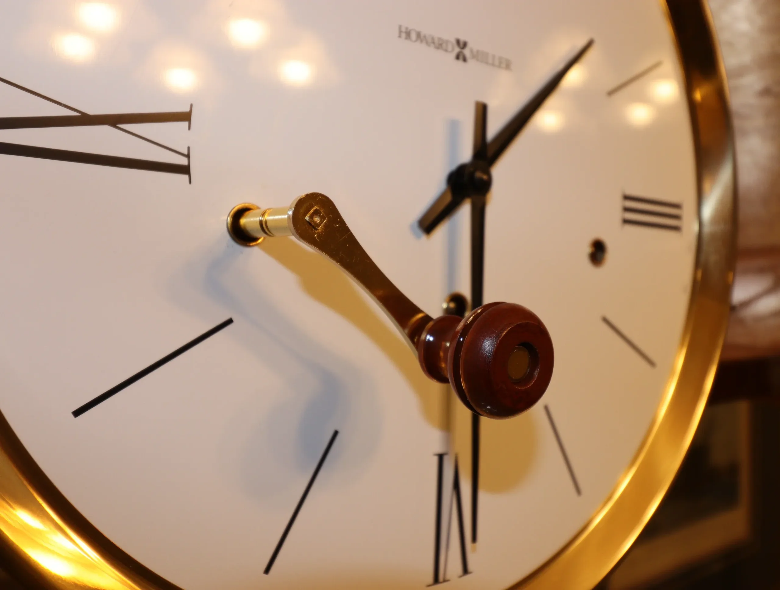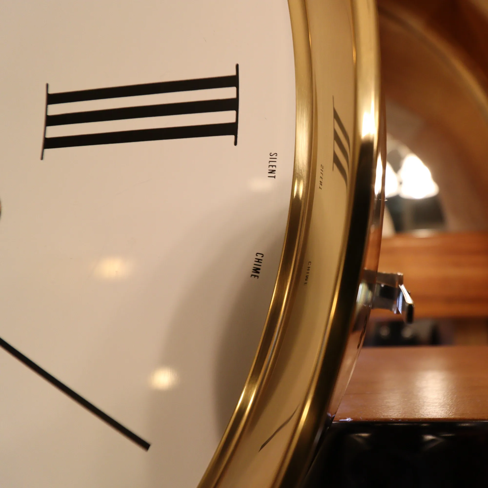 The dial is clean and restrained, with classic Roman numerals and a brushed brass bezel. The clock is powered by a cable-driven mechanical movement and plays the Westminster chime, delivering a rich, traditional tone on the quarter hour.