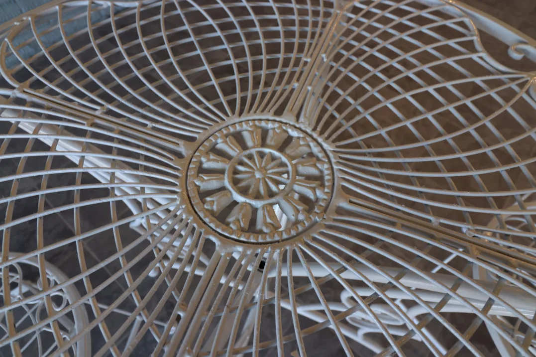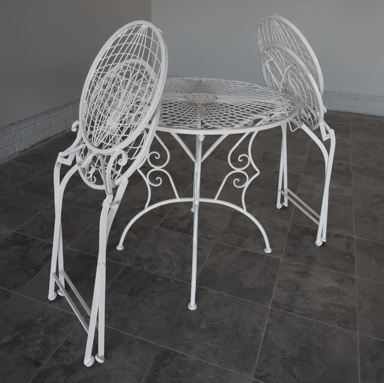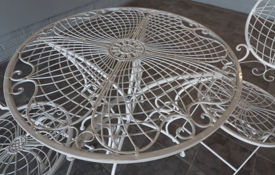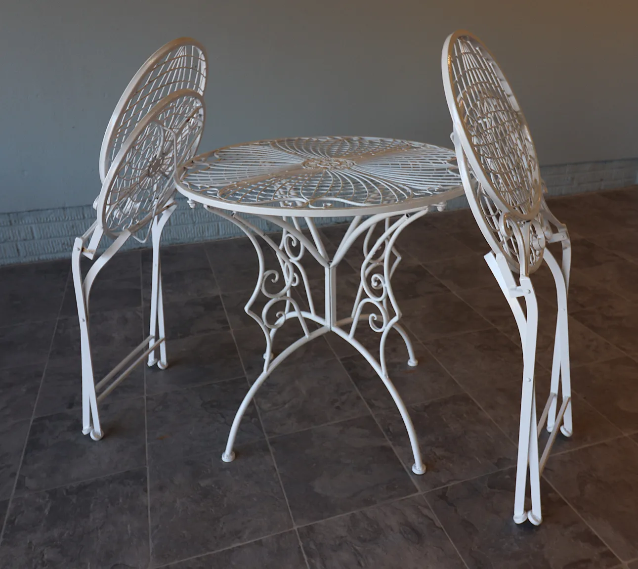 The folding chairs are a classic element of Italian garden furniture from this era—lightweight, practical, and refined—while the table’s intricate lattice top radiates from a central rosette, creating a dynamic visual pattern from every angle. Finished in a soft white enamel, the set is ideal for both indoor and outdoor environments, including conservatories, balconies, patios, breakfast nooks, and boutique commercial spaces.