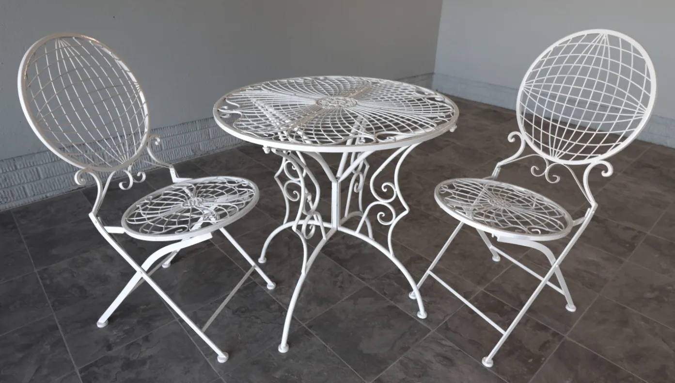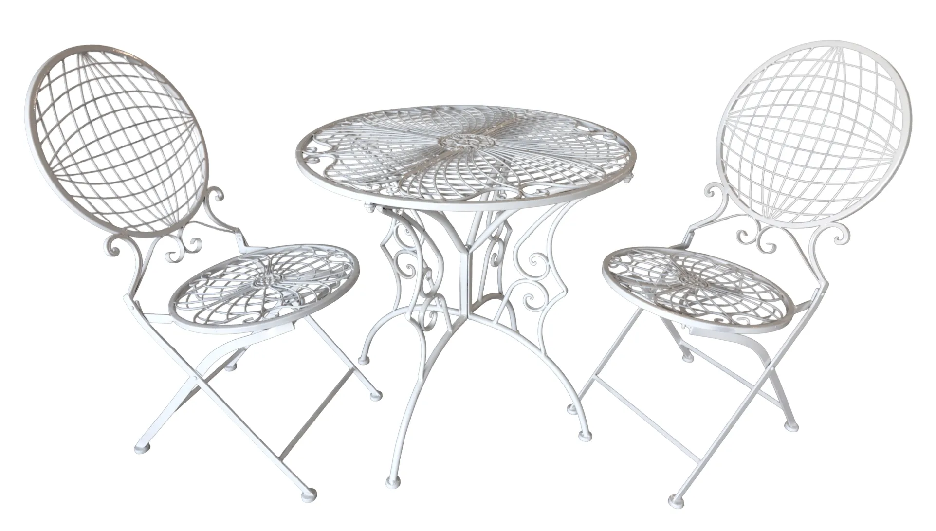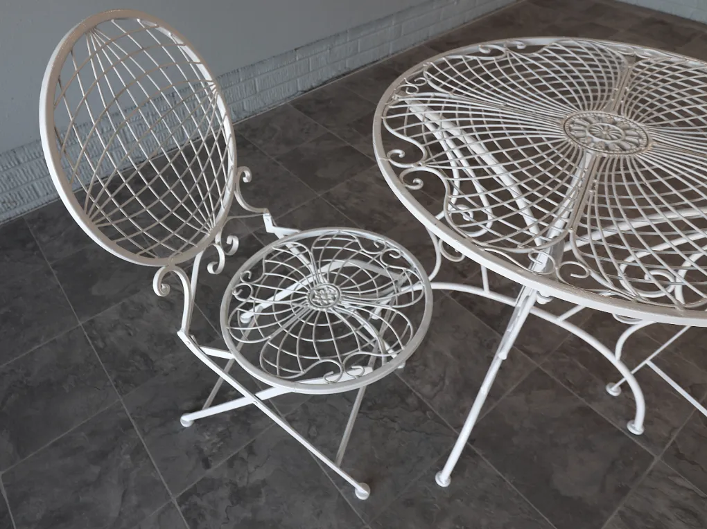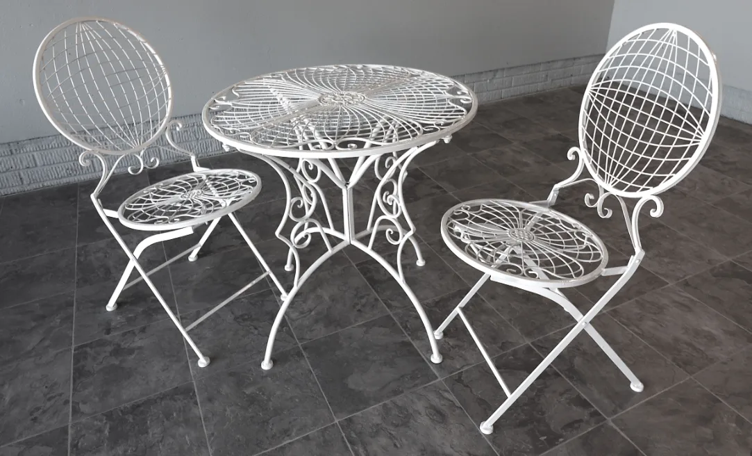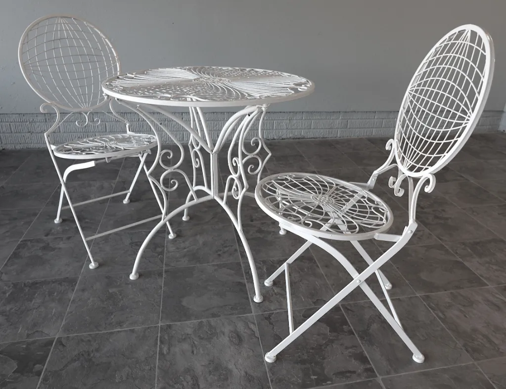 The folding chairs are a classic element of Italian garden furniture from this era—lightweight, practical, and refined—while the table’s intricate lattice top radiates from a central rosette, creating a dynamic visual pattern from every angle. Finished in a soft white enamel, the set is ideal for both indoor and outdoor environments, including conservatories, balconies, patios, breakfast nooks, and boutique commercial spaces.