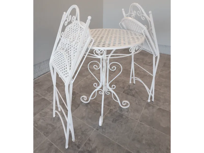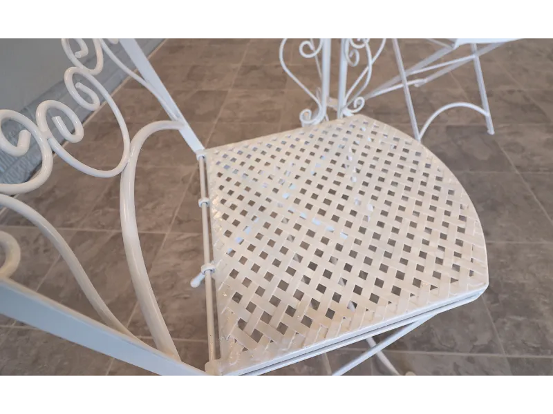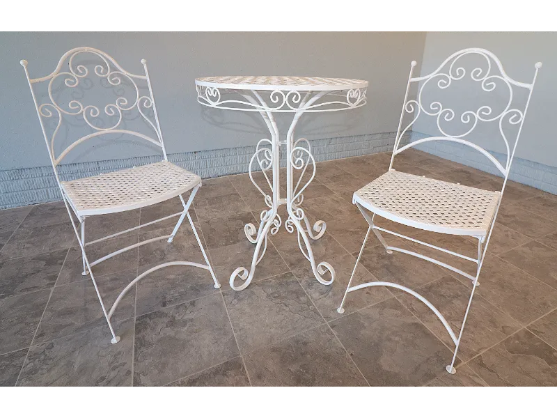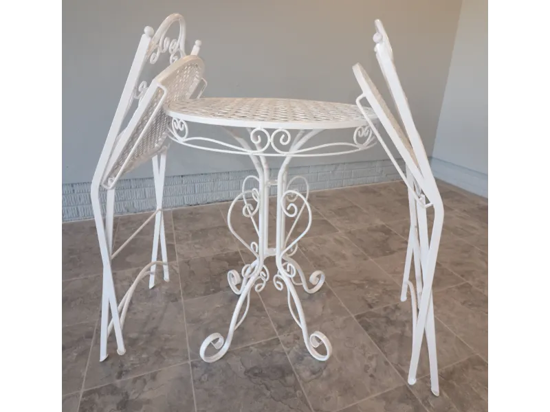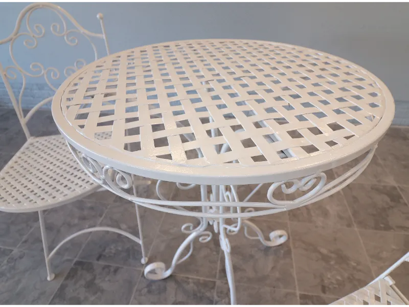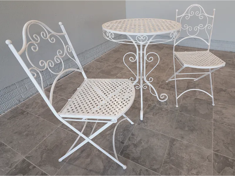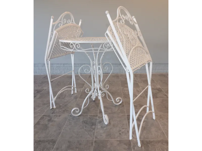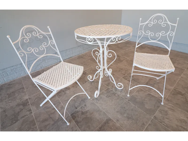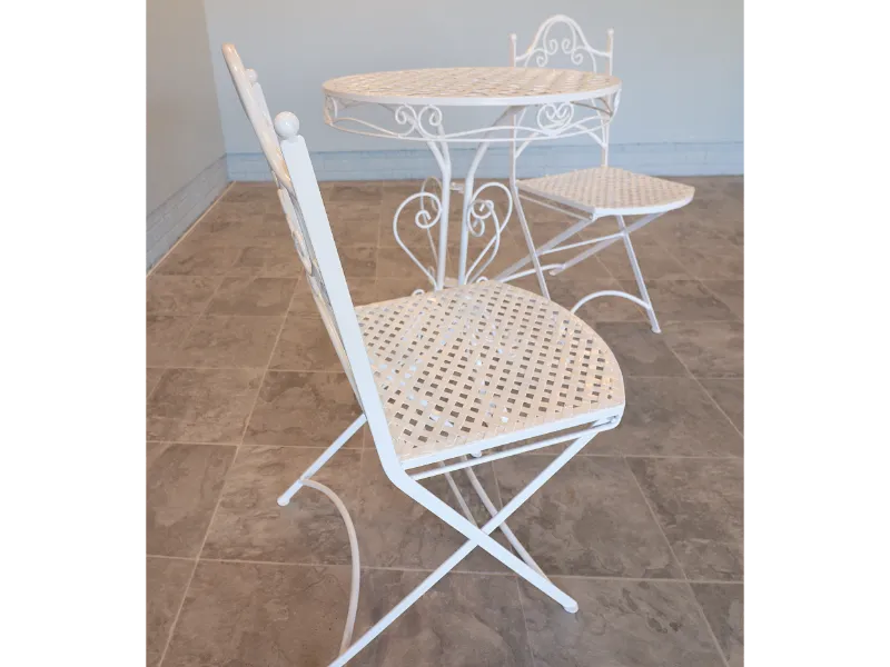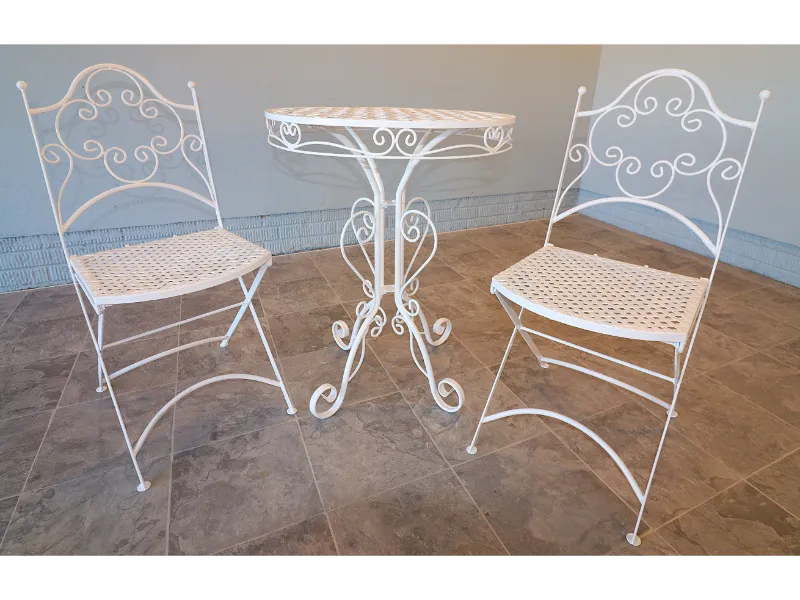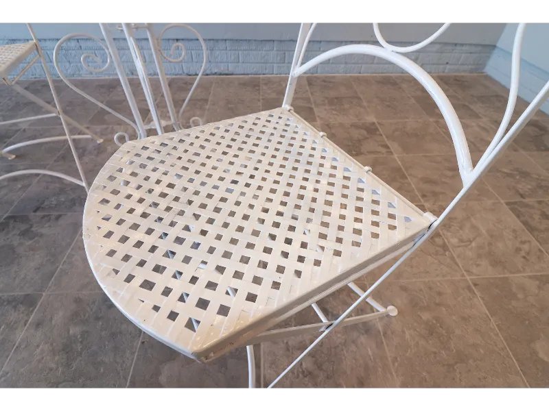 The chairs fold smoothly for ease of use and storage, while the table retains a light, refined profile suited to balconies, terraces, sunrooms, or garden settings. The ironwork reflects the restrained elegance of postwar American patio design, favoring airy forms over the heavier massing of later outdoor furniture.