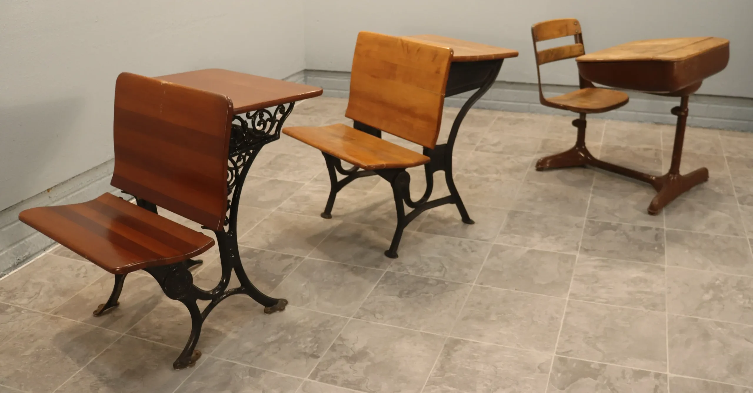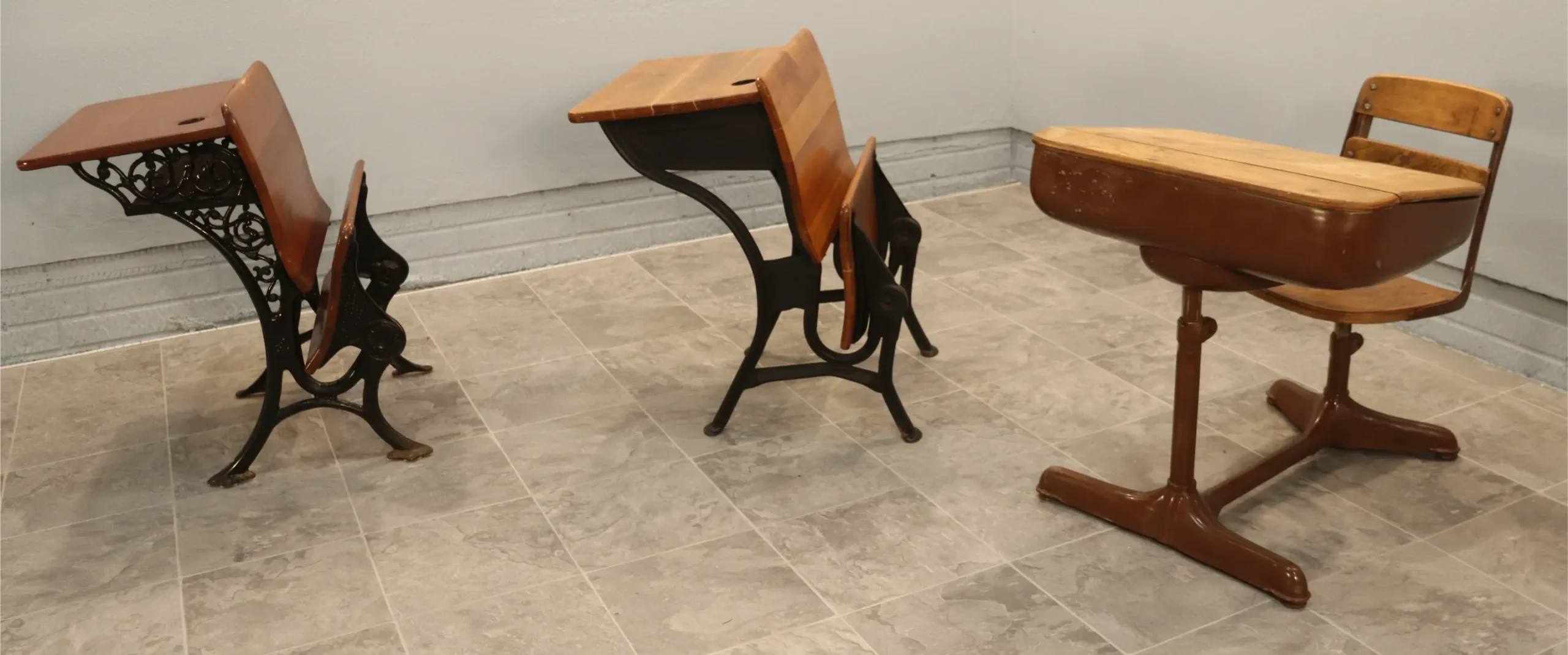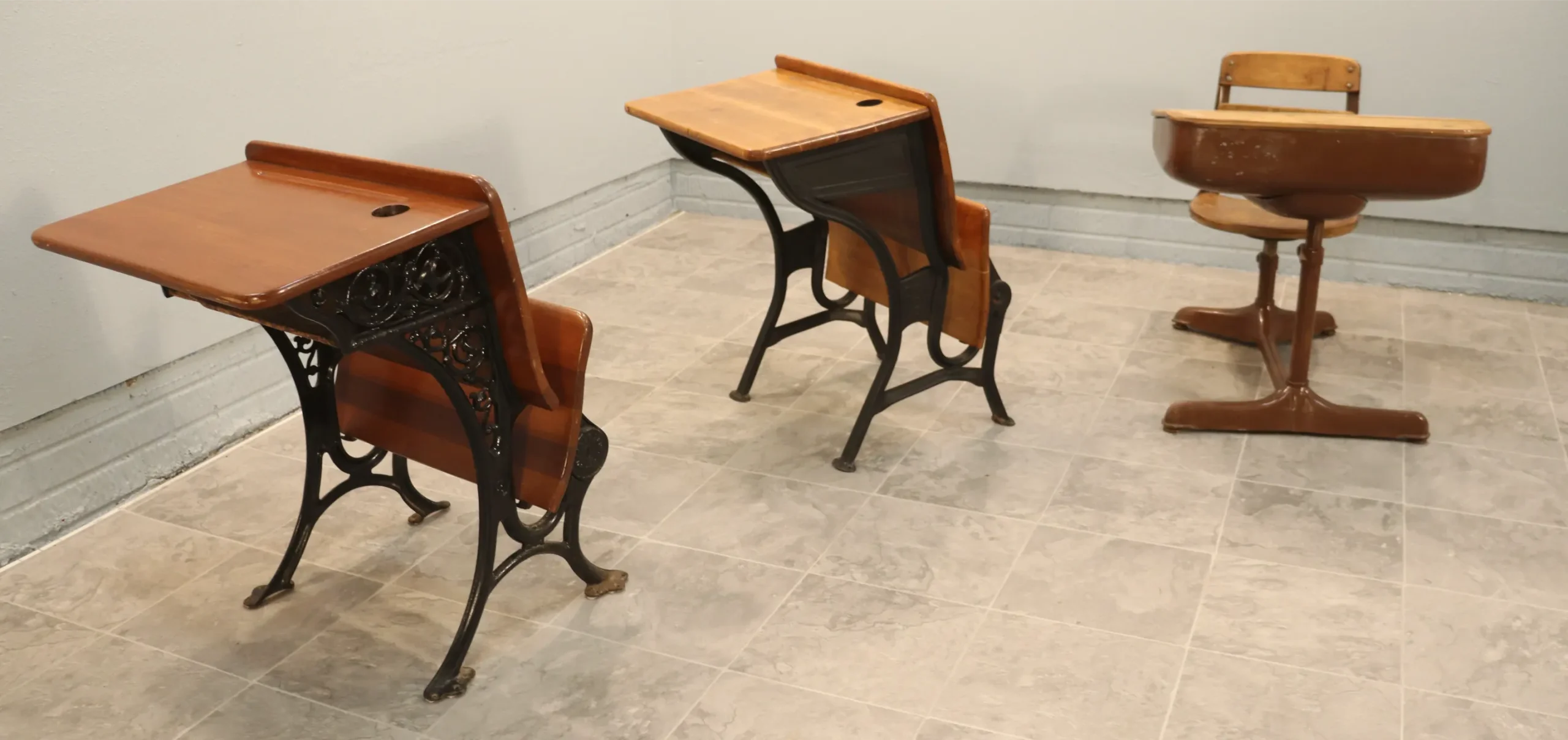 This curated set of three authentic American school desks spans the late 19th to early 20th century and illustrates the evolution of classroom furniture from ornamental cast iron to streamlined Progressive-Era steel construction.