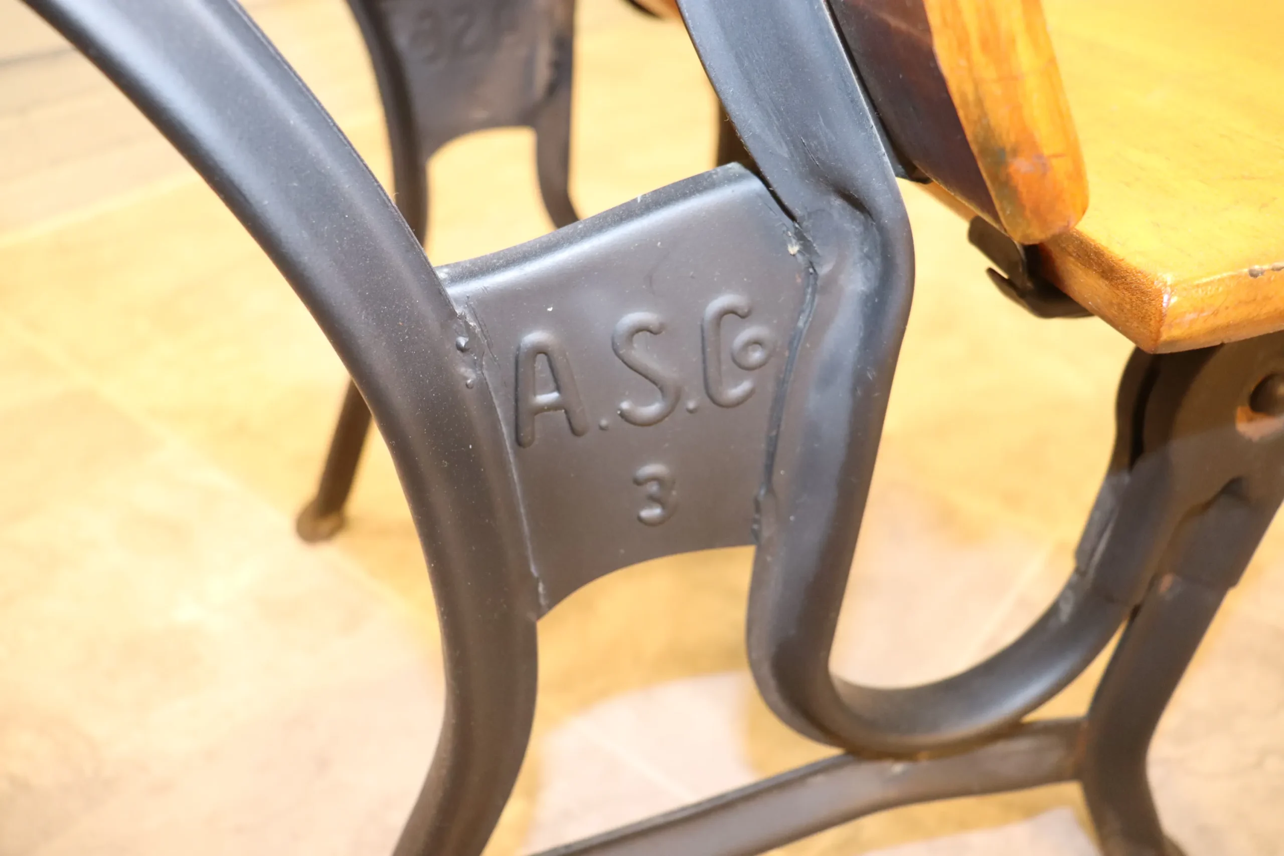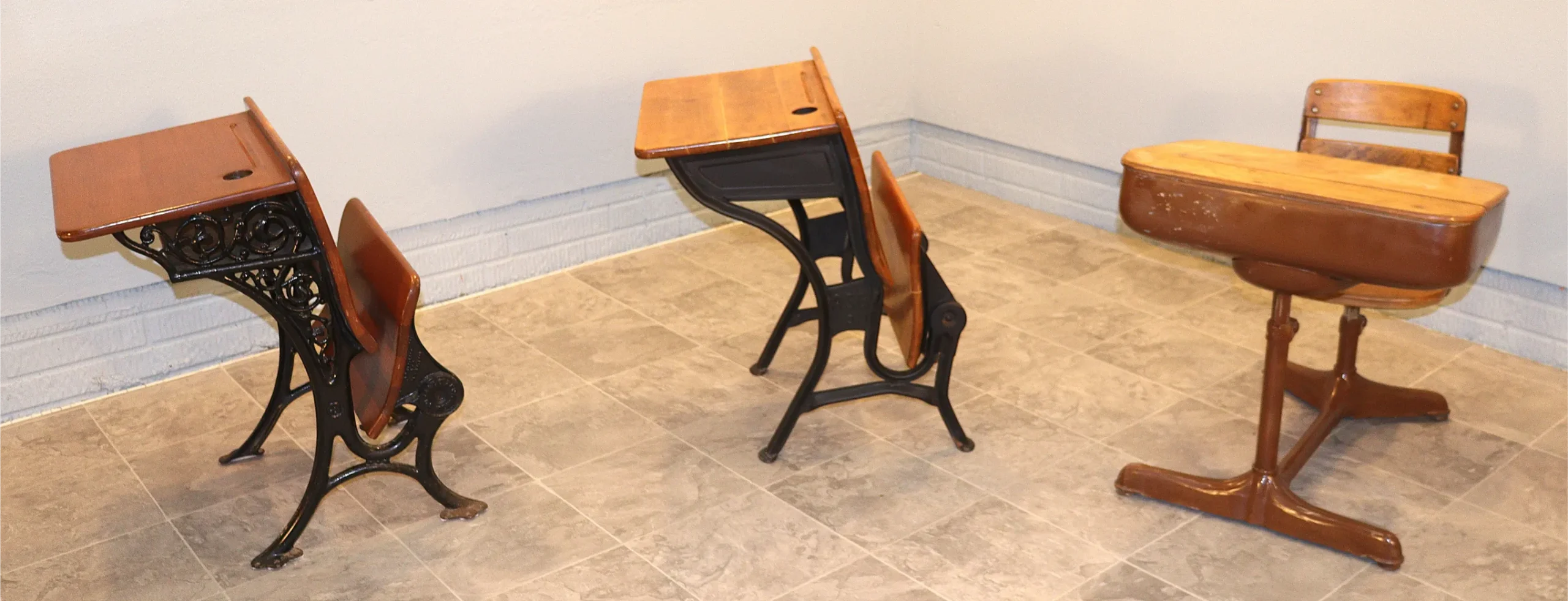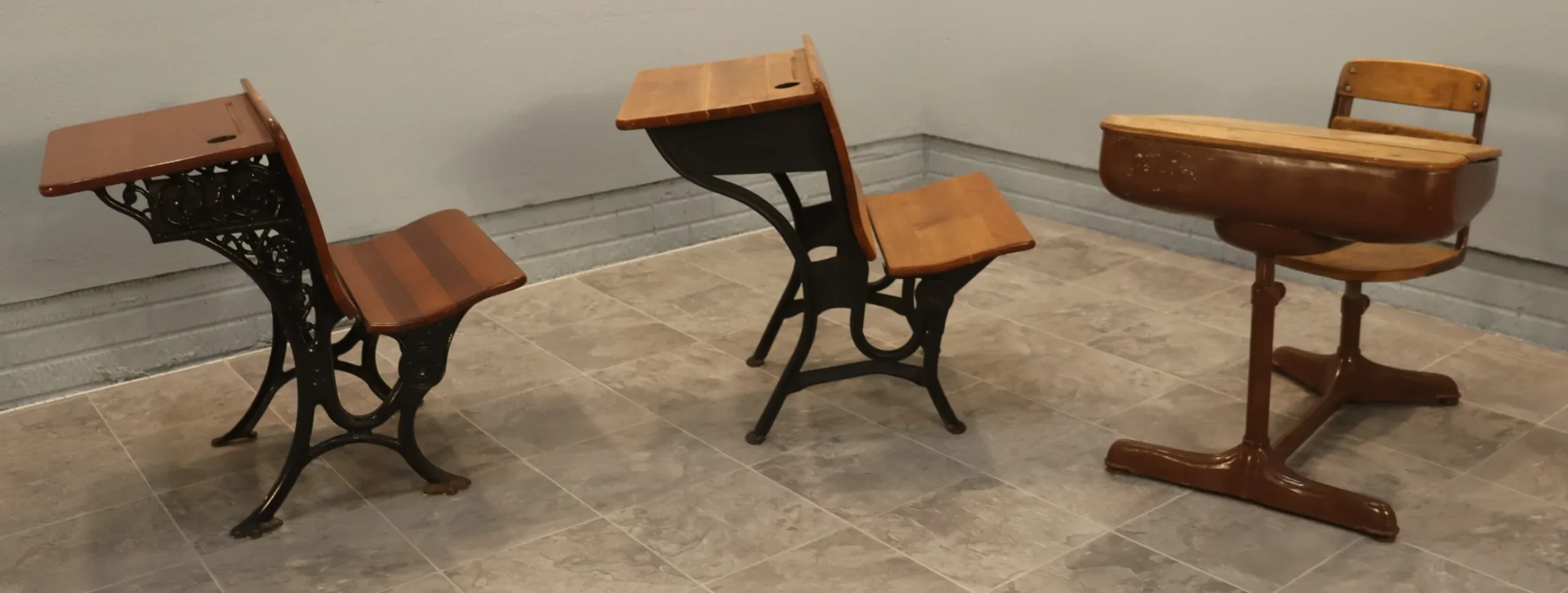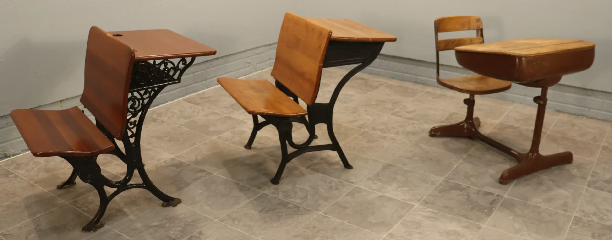 This curated set of three authentic American school desks spans the late 19th to early 20th century and illustrates the evolution of classroom furniture from ornamental cast iron to streamlined Progressive-Era steel construction.