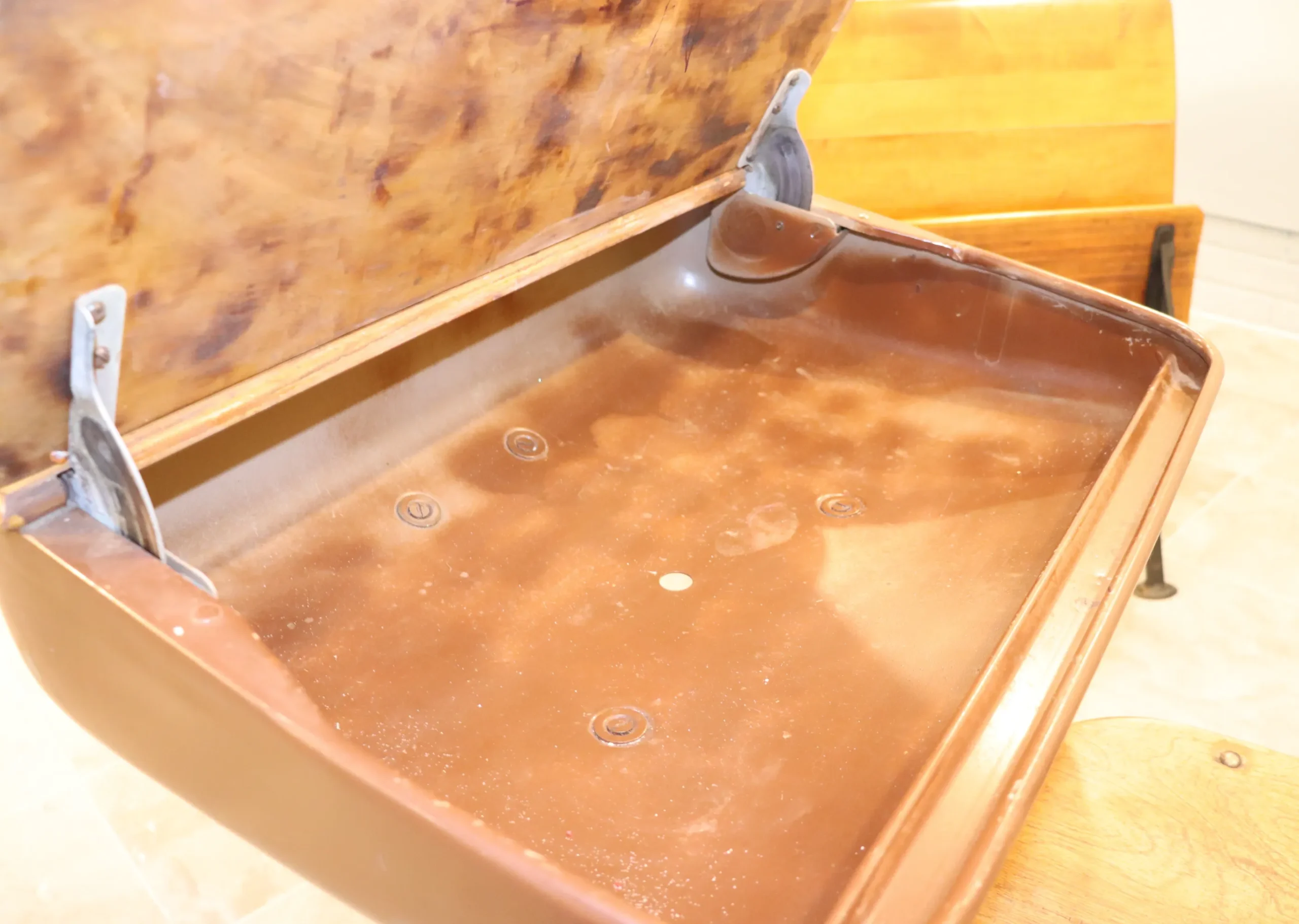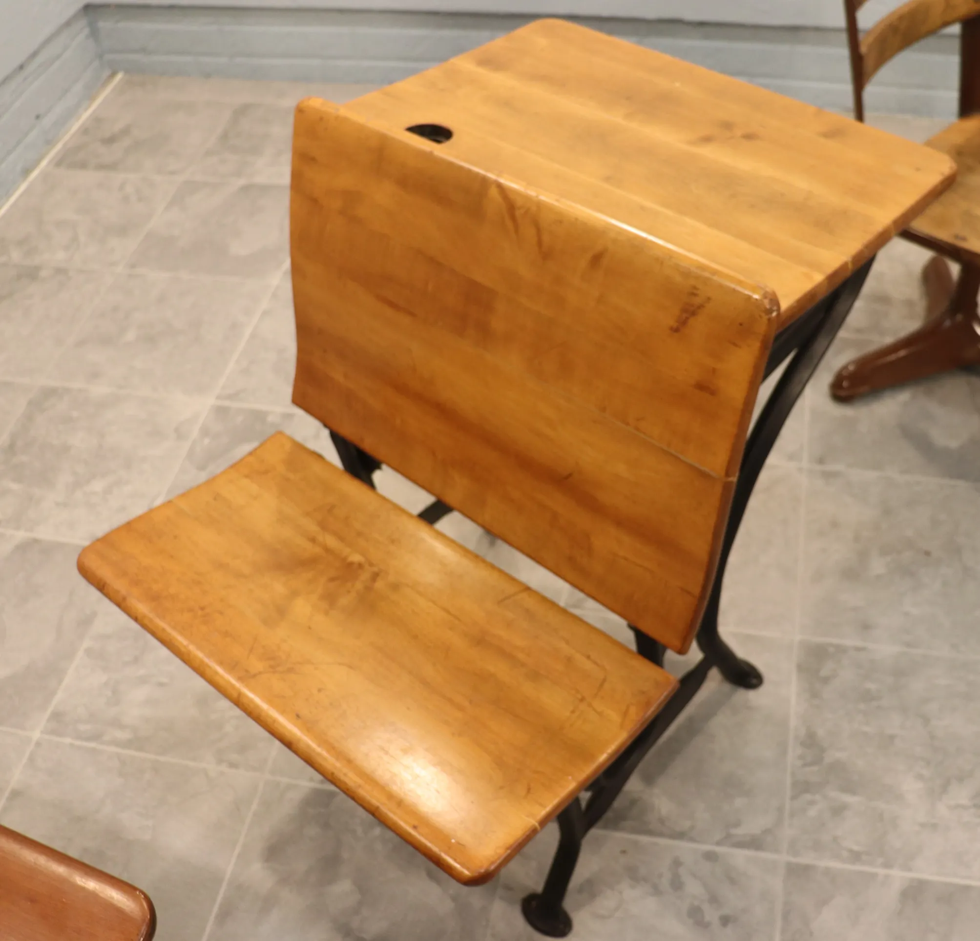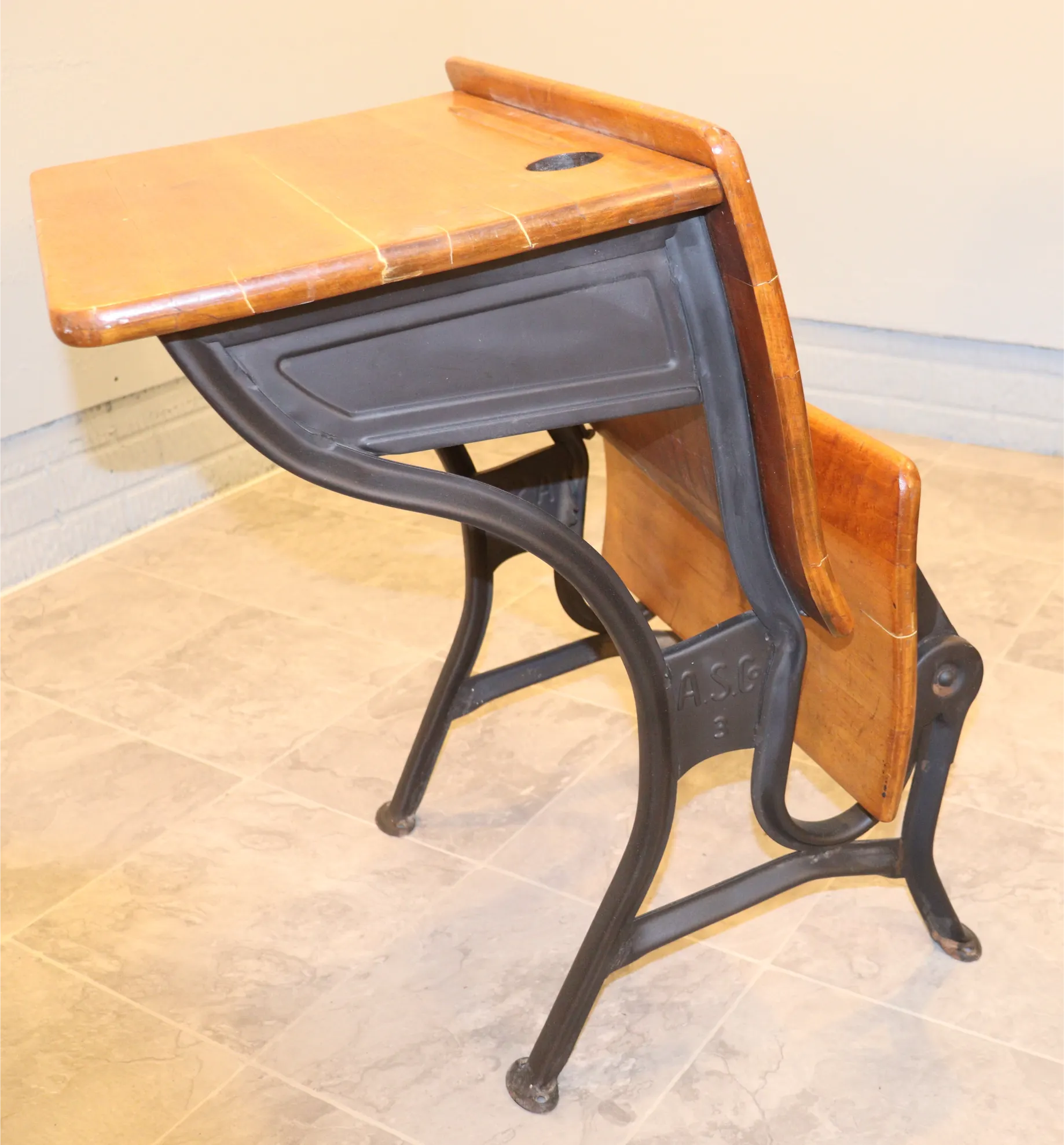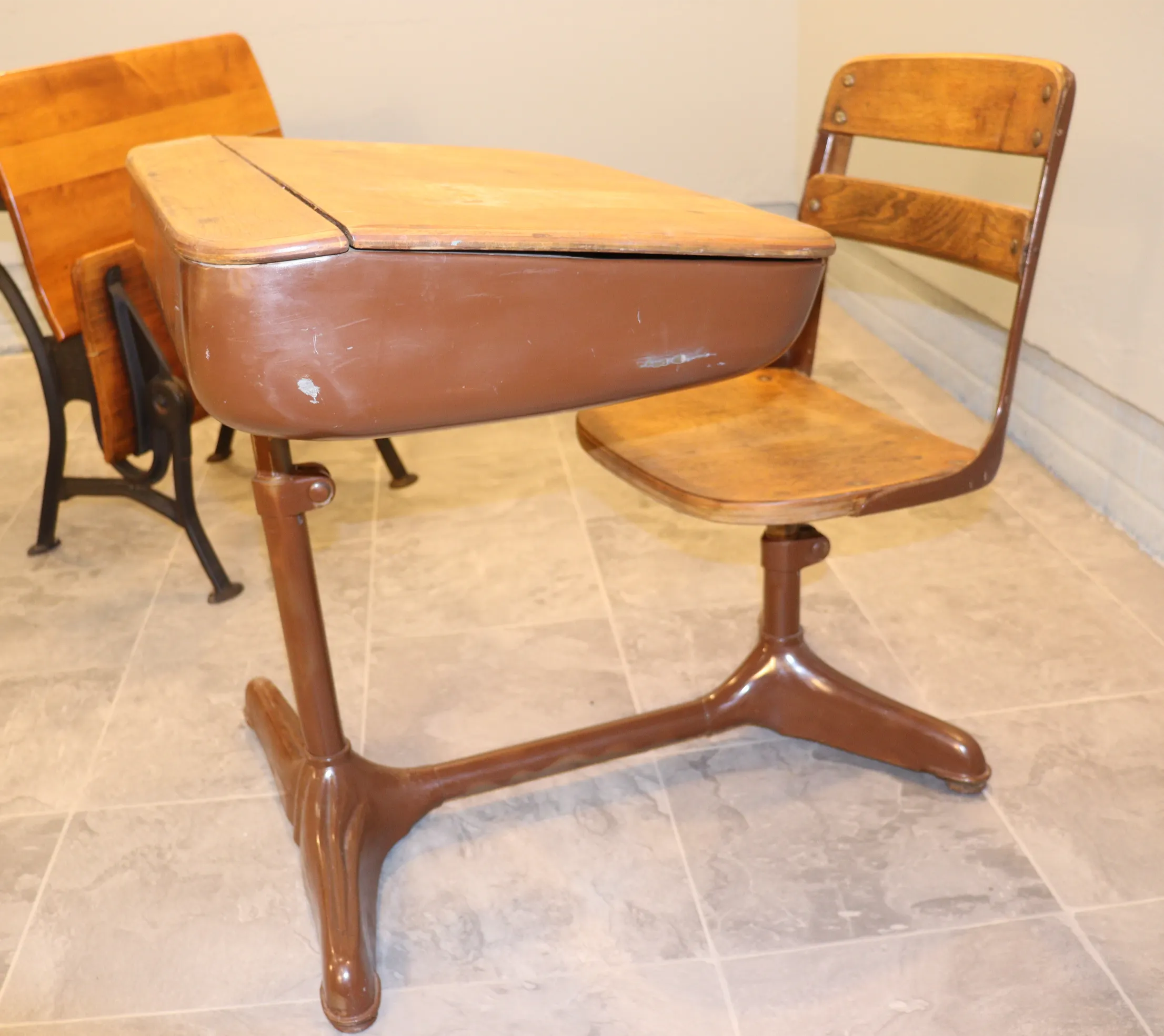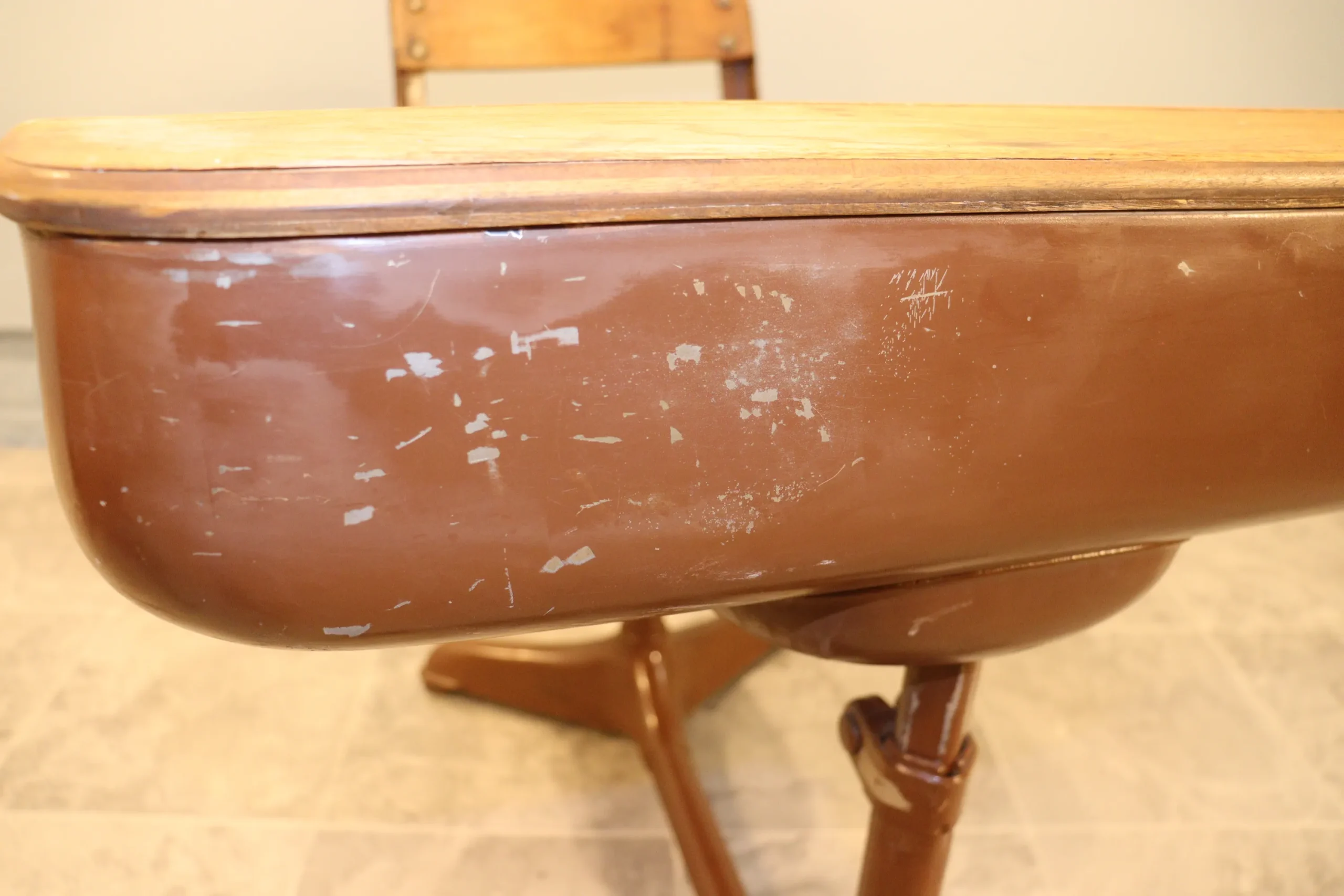 Original metal finishes show areas of paint loss, scuffing, and surface wear consistent with age and classroom use.