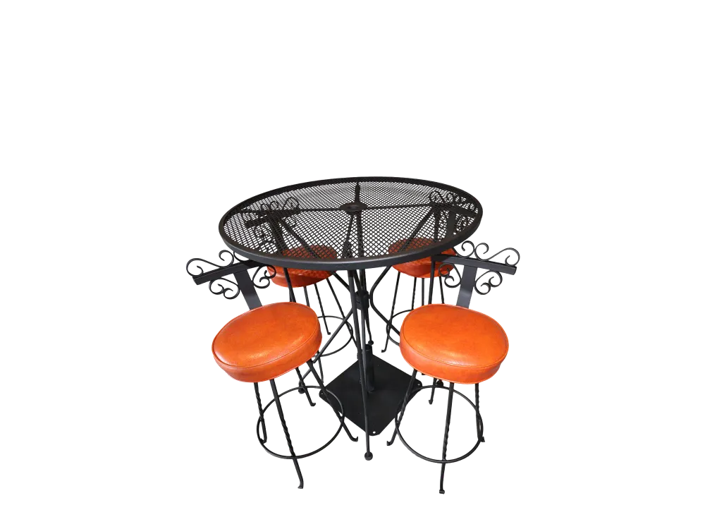 The stools feature full 360° swivel mechanisms in excellent working order, combining mid-century style with everyday comfort. The matching bar table stands at an ideal 41″ height with a 36″ diameter mesh top, perfectly proportioned for the stools. The umbrella stand is designed for stability and can accommodate a full-size outdoor umbrella, allowing for shaded seating if desired.