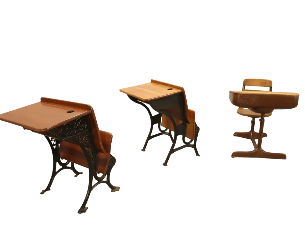This curated set of three authentic American school desks spans the late 19th to early 20th century and illustrates the evolution of classroom furniture from ornamental cast iron to streamlined Progressive-Era steel construction.