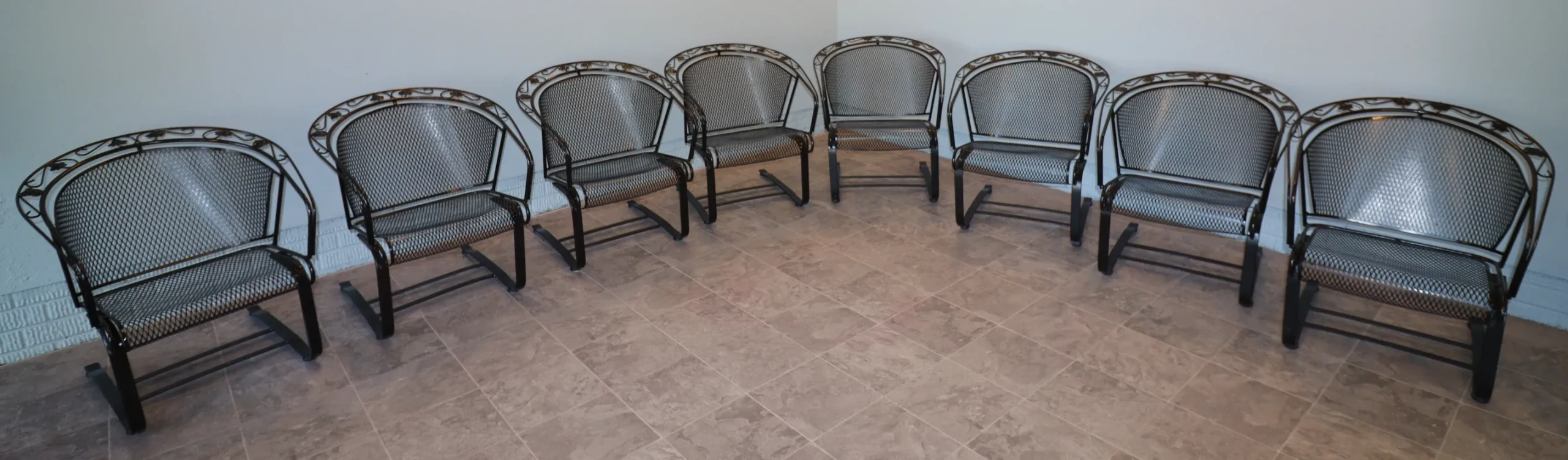 A complete set of eight Russell Woodard wrought iron casual chairs from the sought-after Ivy Leaf line. Each chair features the signature hand-applied leaf medallions and scrolling crest rail, paired with a sculpted mesh seat and back. The frames sit on Woodard’s classic barrel rocker base—subtle motion, balanced stance, and far more comfortable than fixed wrought iron forms.