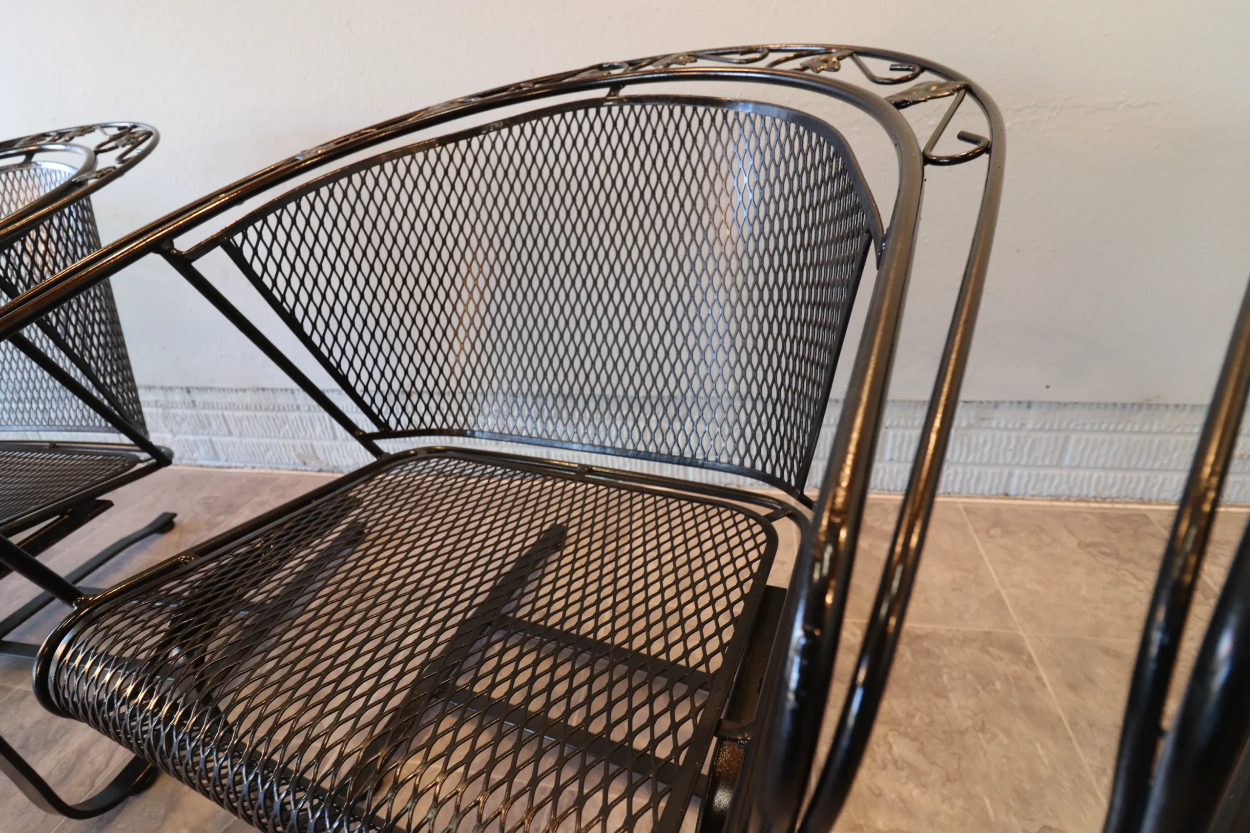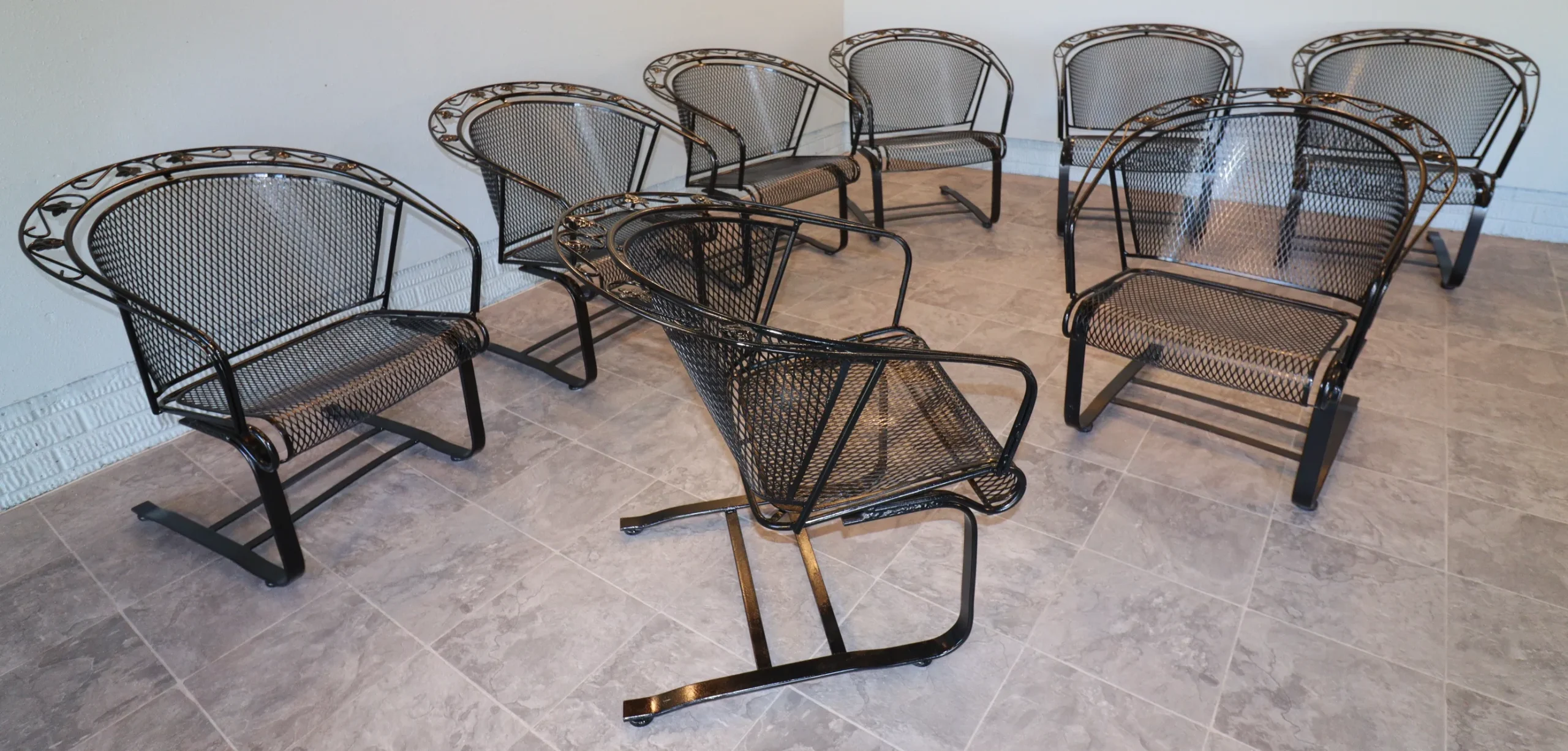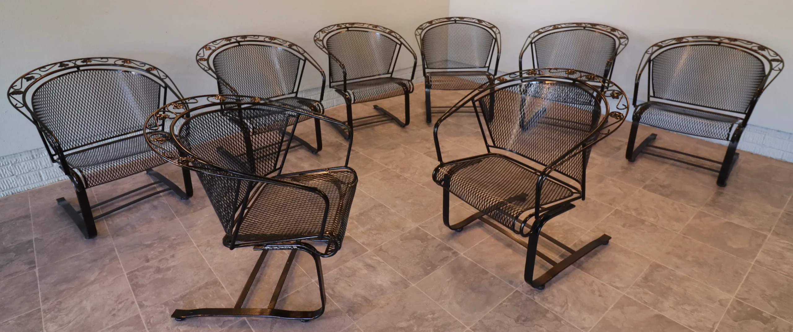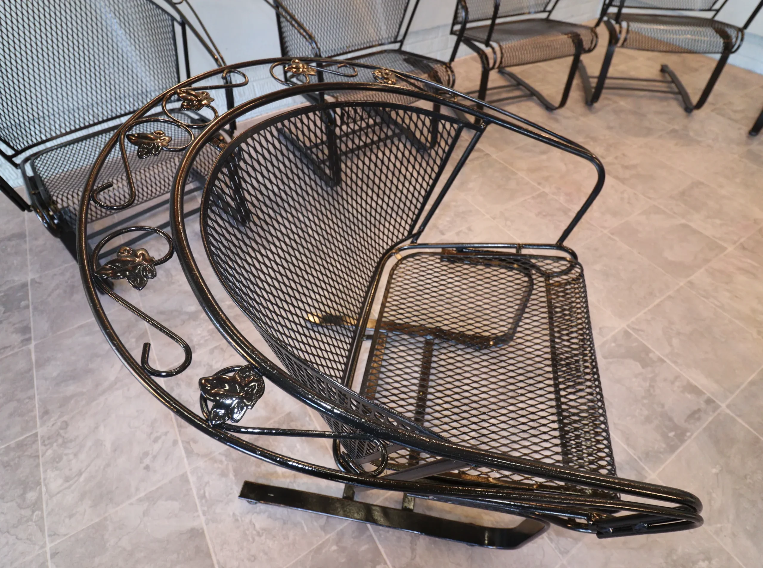 All eight chairs match. The set presents cleanly with a fresh, even finish and sharp definition in the leaf appliqués and scrollwork. Mesh is tight, frames are true, and the rocking action is consistent across the group. Protective floor glides have been installed on each chair, allowing for smooth movement while safeguarding interior surfaces—ready for immediate use indoors or out.