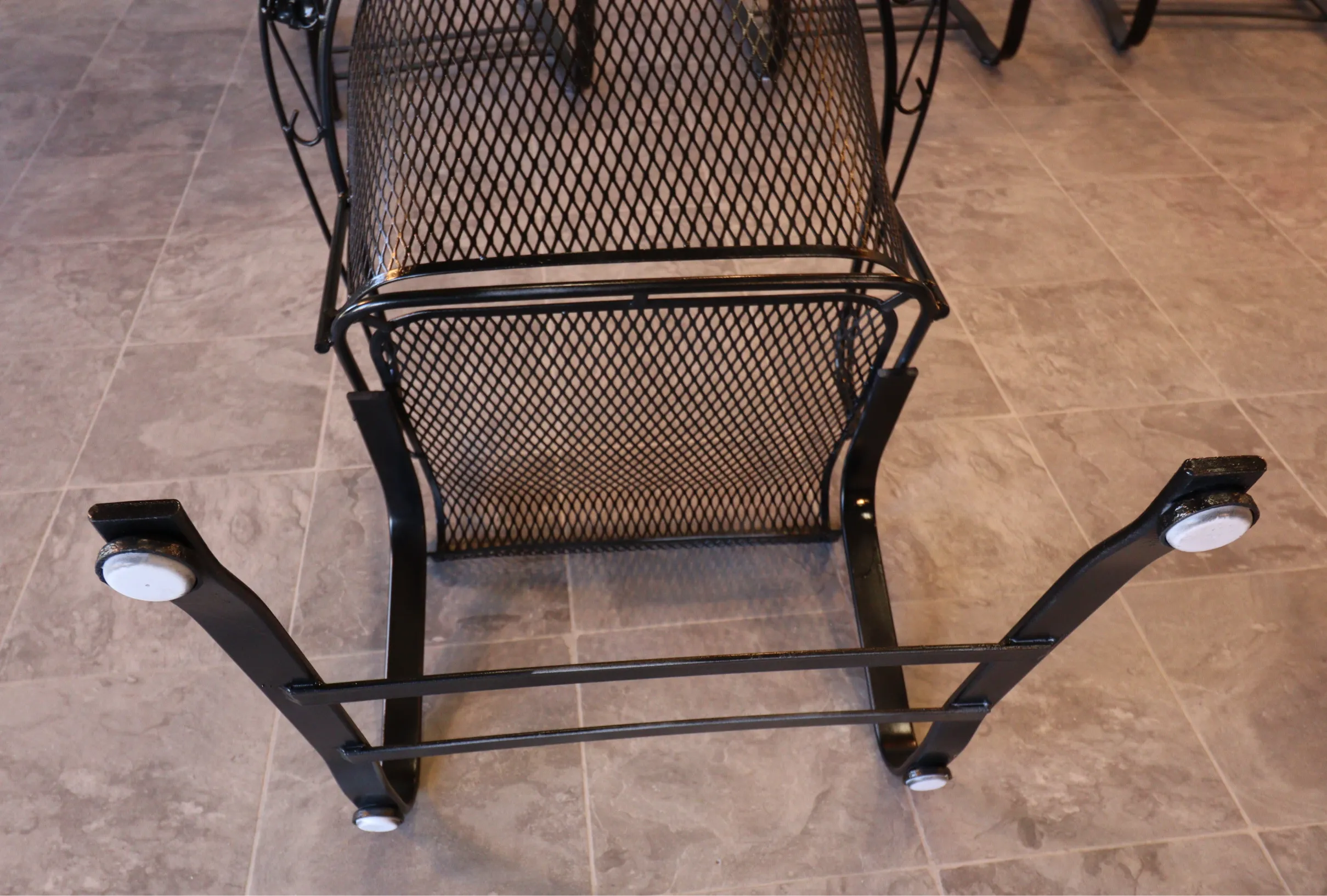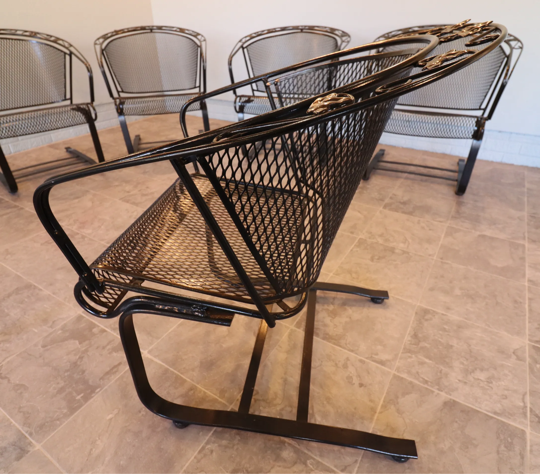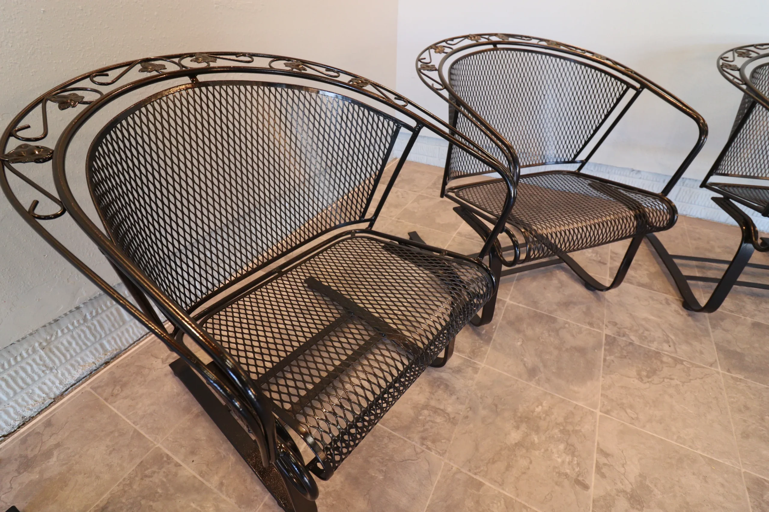 All eight chairs match. The set presents cleanly with a fresh, even finish and sharp definition in the leaf appliqués and scrollwork. Mesh is tight, frames are true, and the rocking action is consistent across the group. Protective floor glides have been installed on each chair, allowing for smooth movement while safeguarding interior surfaces—ready for immediate use indoors or out.