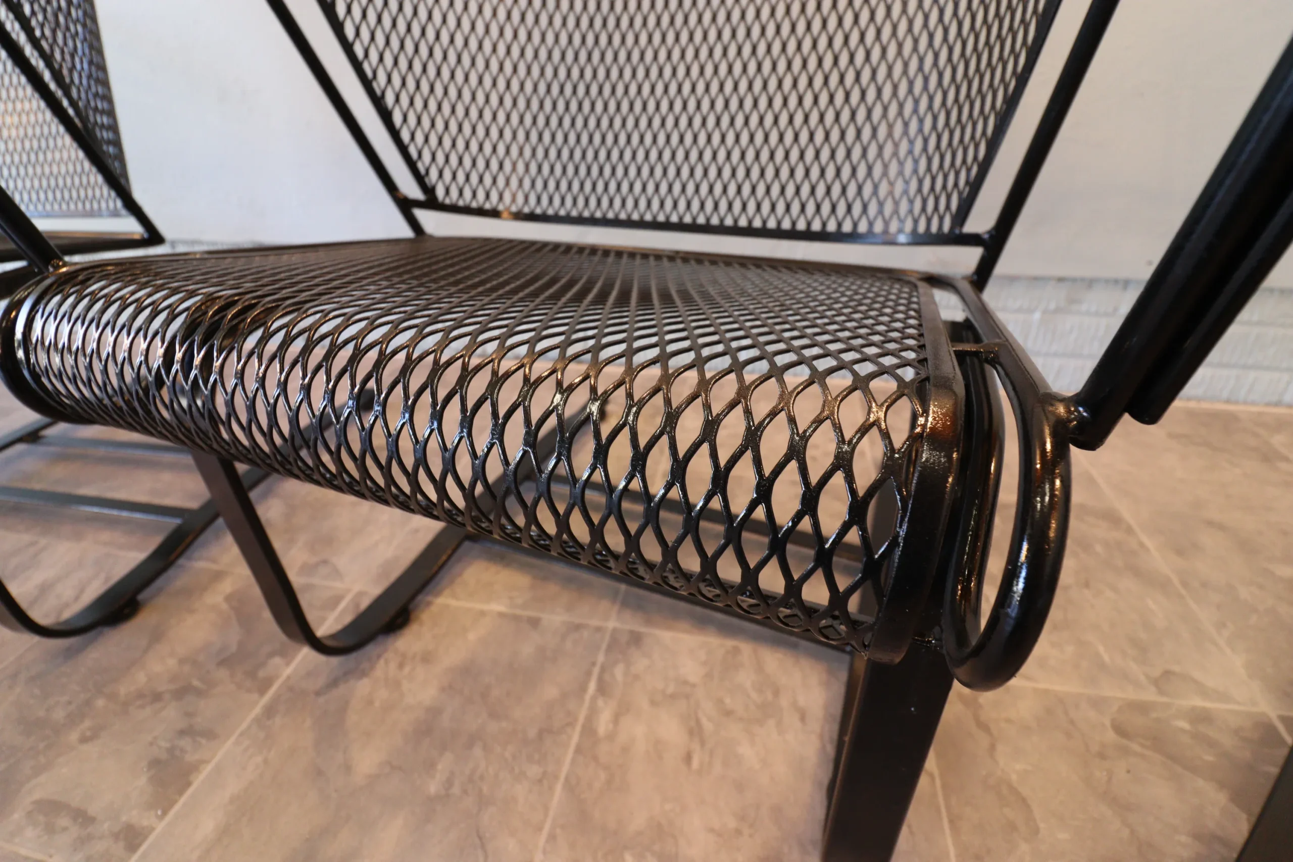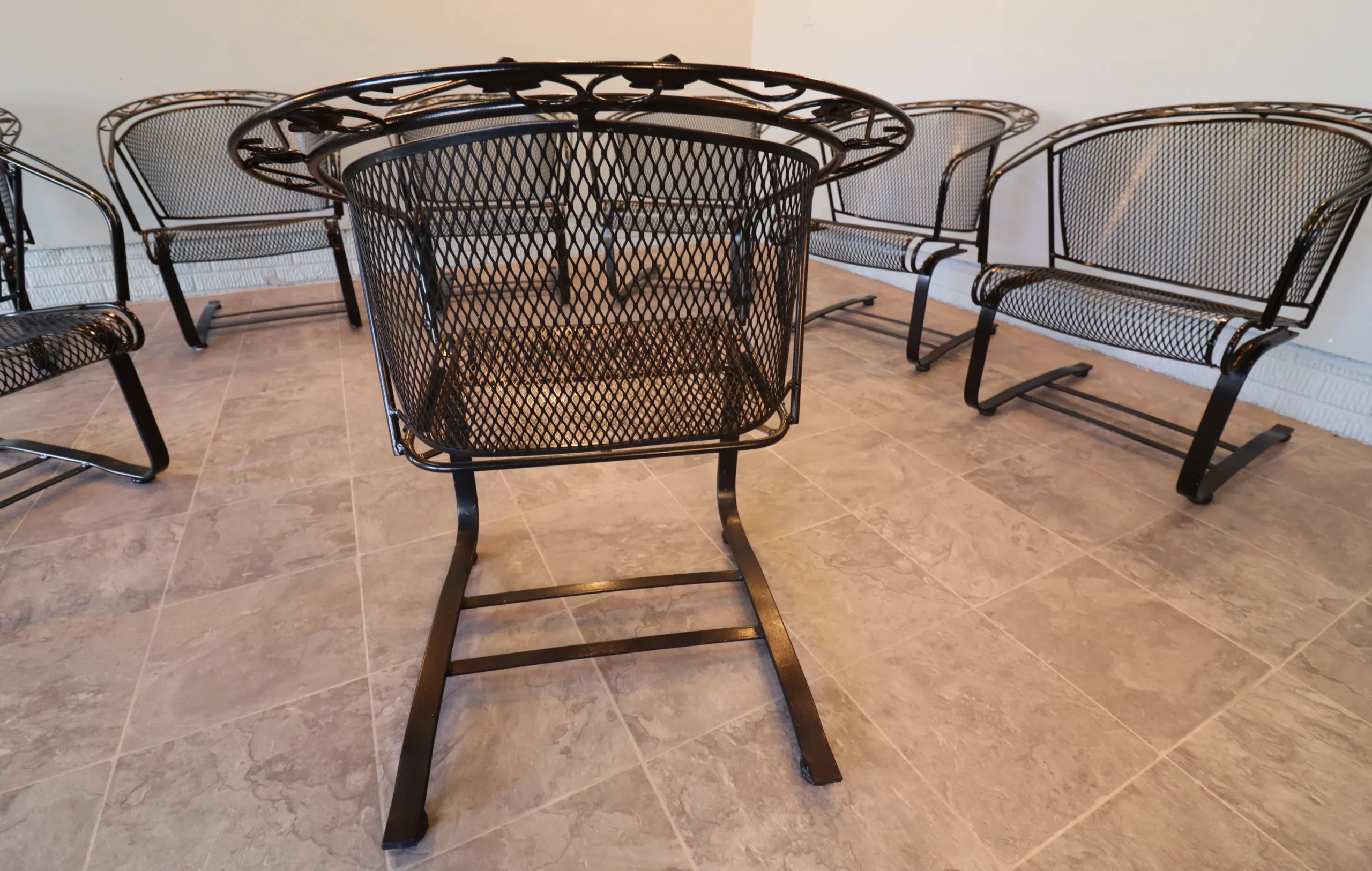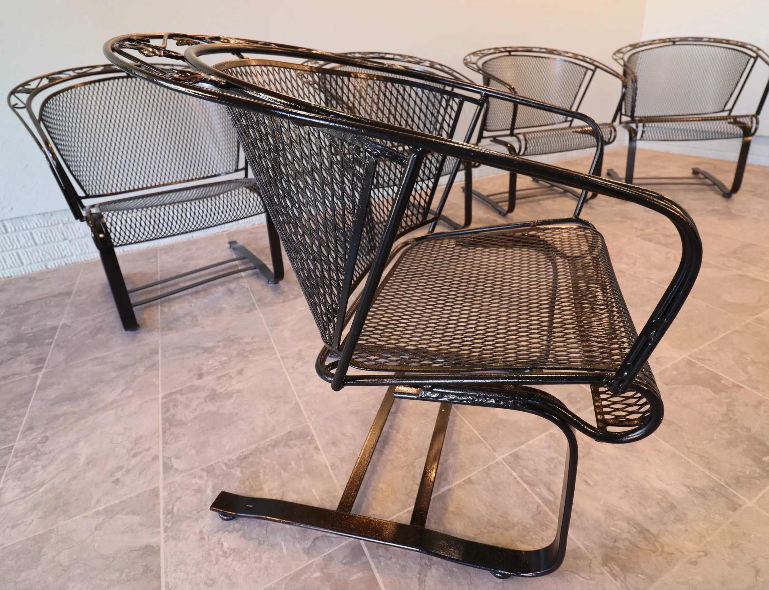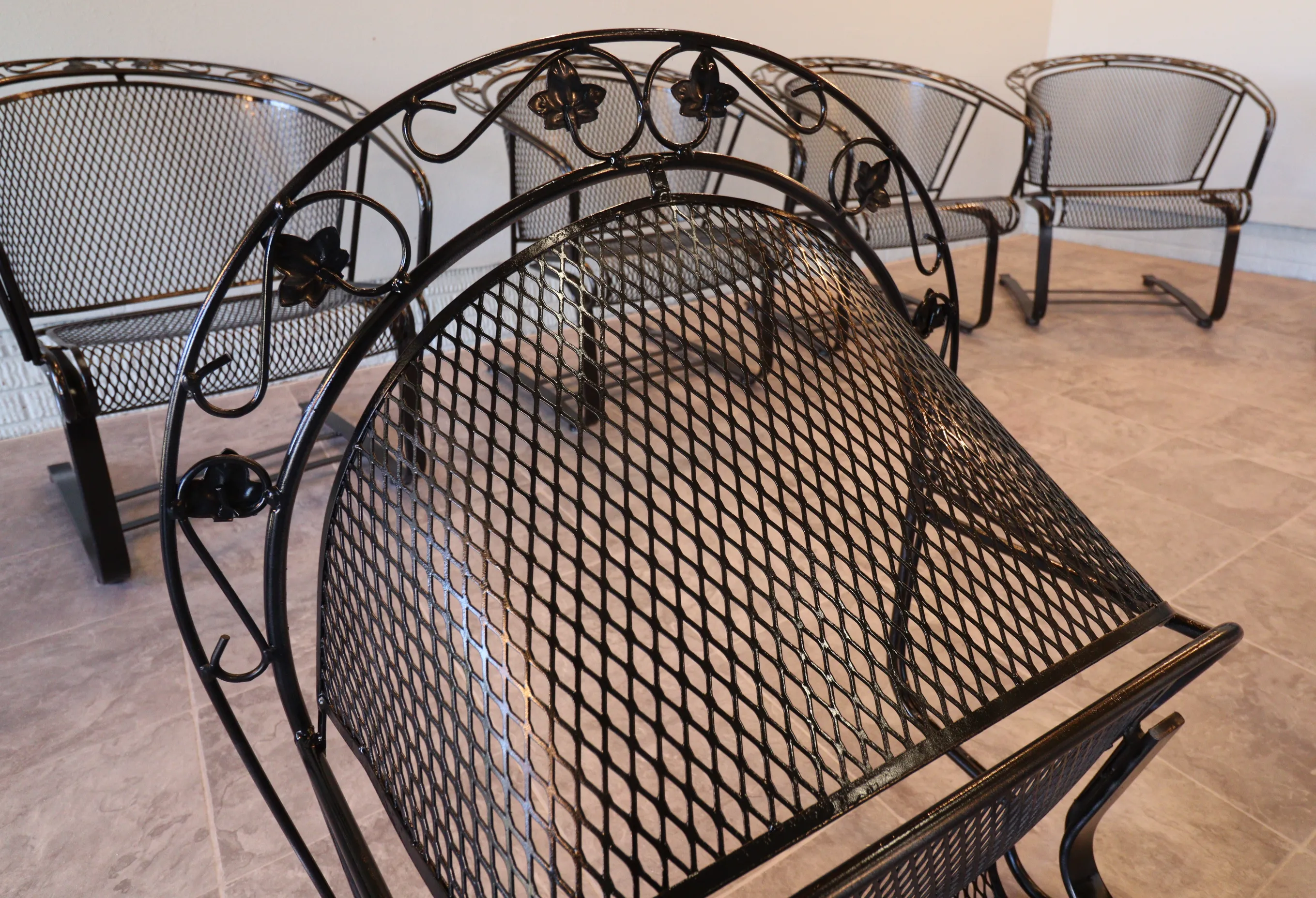 All eight chairs match. The set presents cleanly with a fresh, even finish and sharp definition in the leaf appliqués and scrollwork. Mesh is tight, frames are true, and the rocking action is consistent across the group. Protective floor glides have been installed on each chair, allowing for smooth movement while safeguarding interior surfaces—ready for immediate use indoors or out.